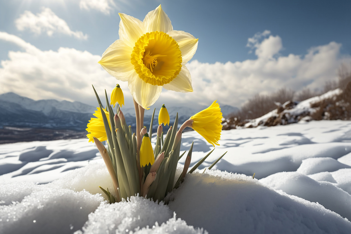 Print of a portrait of a yellow daffodil blooming in the Sierra snow.